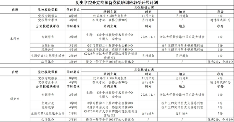 为深入学习贯彻习近平新时代中国特色社会主义思想,全面贯彻党的二十大和二十届四中全会精神,贯彻落实习近平总书记对浙江大学的重要指示精神和浙江省委常委关于浙江大学专题会议精神,落实浙江大学第十五次党代会决策部署,进一步坚定理想信念,提高党性觉悟,严守党纪党规,深刻领悟“两个确立”的决定性意义,自觉增强“四个意识”,坚定“四个自信”,做到“两个维护”,做坚定的青年马克思主义者和合格的共产党员。经研究决定,举办浙江大学党校2025年秋冬学期预备党员培训班历史学院分党校教学安排如下: