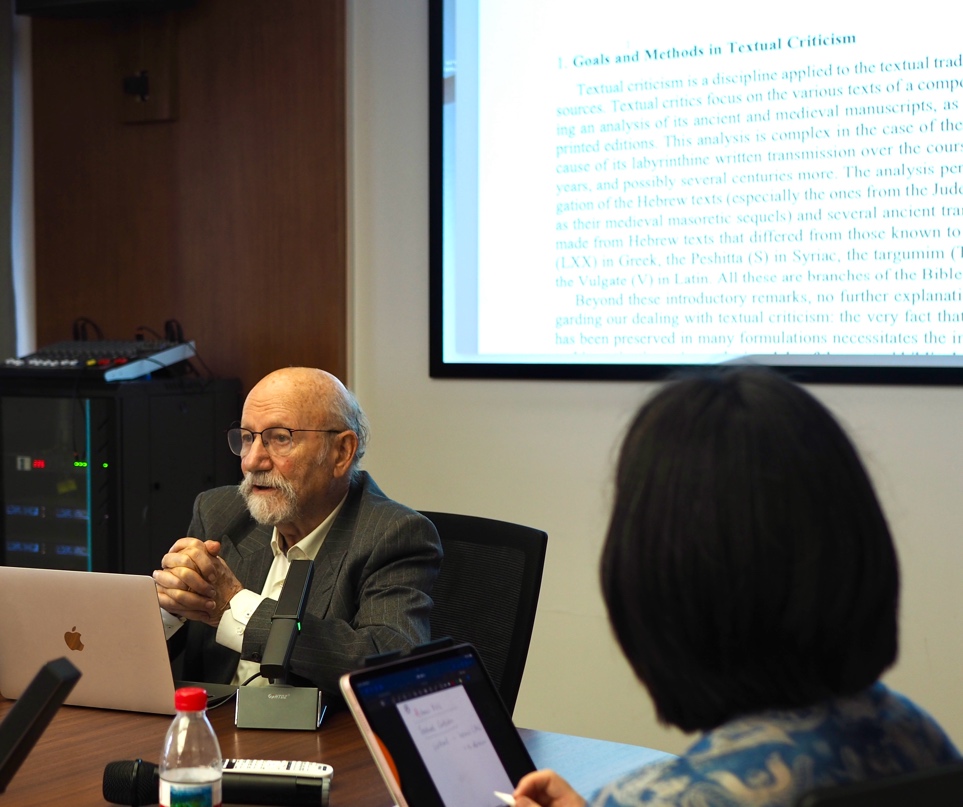 讲座伊始,Tov教授通过类比中国古代文本研究引入对自身领域的介绍。围绕《希伯来圣经》的文本考证(textual criticism)意味着以学术的方式进行批判,依据希腊语中“探究”(ἐπίσκεψις)与“辨析”(διακρίσις)的原则展开,追求对文本信息的深度理解。另外,Tov教授强调,《希伯来圣经》应当被视作古代文献来研究,它的某种现代语言译本并非“唯一的《圣经》”,而只是《圣经》的其中一个版本。