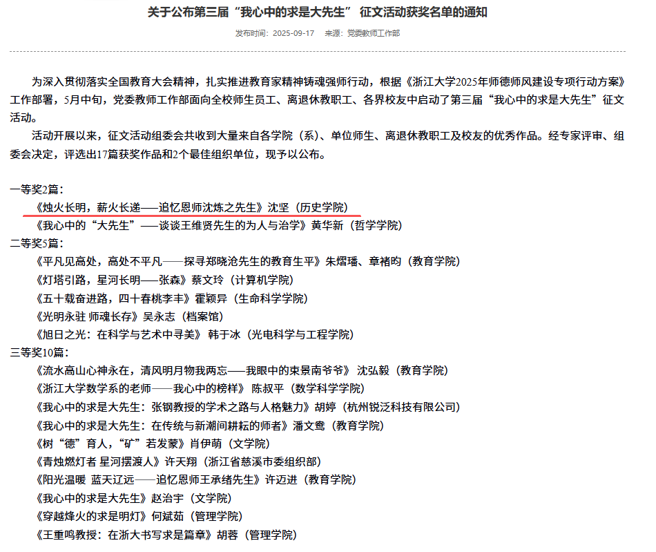 喜报丨沈坚教授作品荣获学校第三届“我心中的求是大先生征文活动”一等奖